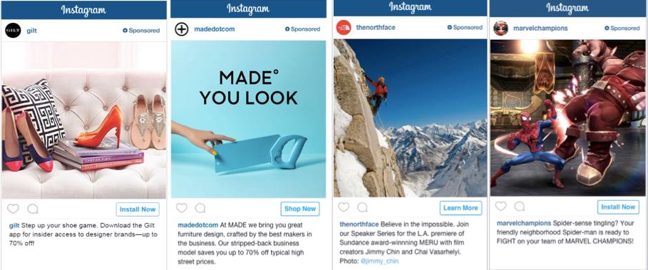 この度、新しい広告形式の導入によって、マーケティング担当者の方々が、ウェブサイトへのアクセスからモバイルアプリのインストールまで、様々な目的を達成し始めています。例えば、「米国ギルト・グループ」は、新規の顧客獲得のために、インスタグラムの広告キャンペーンを実施し、アプリのインストール率を85%上昇させました。また、デザイナーズ家具を販売するオンラインショップ「Made.com」は、通常のベンチマークを10%超すオーダー金額を記録しました。また、ゲーム開発会社の「Kabam」は、ゲームのプレイタイムがより長く、より多く課金する新規ユーザーの獲得に成功しました。そして、アウトドアブランドの「ザ・ノース・フェイス(The North Face)」は、“believe in the impossible (不可能なことを信じろ)”をテーマにしたスピーカーシリーズの認知向上のために、アイコニックな画像を使用してより詳細を知りたいという興味をかきたて、高いエンゲージメントを導き出すことができました。