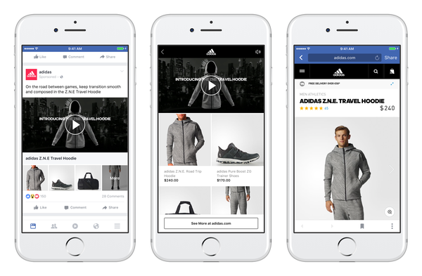 消費者の4人に3人は、ソーシャルメディア上の動画が購買判断に影響すると答えています2。アディダスやトミー・ヒルフィガーといったブランドは、コレクション広告で動画と商品カタログを効果的に組み合わせ、早くも成果をあげています。コレクション広告を利用したキャンペーンの詳細についてはFacebookのビジネスブログFacebook Businessをご確認ください。