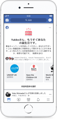 海外では、自分の誕生日をきっかけに募金キャンペーンを立ち上げ寄付を募る人が多くいます。このような背景から、日本でも誕生日が近づくと、ご自身のFacebookアカウントに「非営利団体のための募金キャンペーン」の作成を呼びかけるお知らせが表示されます。作成した募金キャンペーンページにご自身で募金することや、シェアをして友人などに寄付を募ることが可能です。