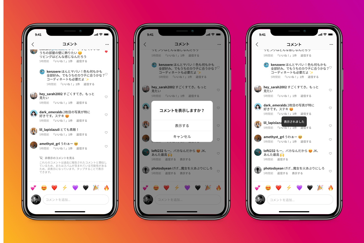 この数日間で、新たな機能のテストを始めました。過去に報告された類似のコメントを、自動的に非表示にする機能です。Instagramの調査では、利用者はネガティブなコメントを見たくなくても、非表示になったコメントの種類は把握したいと思っていることがわかりました。その場合は、「非表示のコメントを見る」をタップすると引き続き見ることができます。コミュニティガイドラインに違反するコメントは、今後も自動的に削除されます。