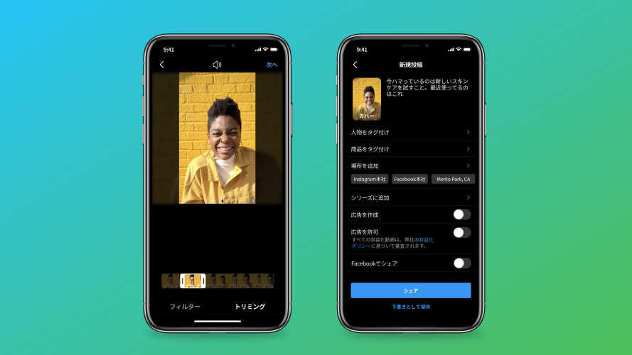現在、Instagram上では多くの利用者が動画コンテンツを日常的に楽しみ、ビジネスやクリエイターもストーリーを伝えたり、ファンや顧客と繋がったりするために動画を積極的に活用しています。このような背景から、フィード動画とIGTV動画をひとつのフォーマットとして統合し、動画コンテンツを発見する際と投稿する際、どちらにおいてもよりシンプルな仕組みに変更することにしました。