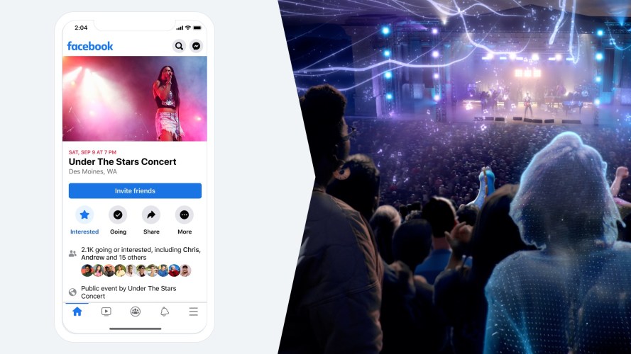 - エンターテイメント: 現在でもFacebook上で有料のオンラインイベントを開催することはできますが、そのイベントを複合現実の体験にできるとしたらどうでしょうか。会場に直接足を運ぶ選択肢と仮想体験のチケットを購入する選択肢の両方を用意できるかもしれません。Connectでは、2人の友達が、片方は現地の会場で、もう片方はメタバースで同じコンサートを楽しむ例をご紹介しました。