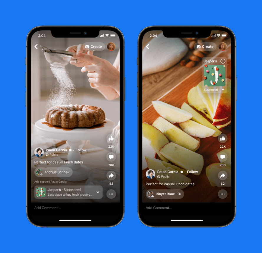 また、Facebookリールのバナー広告とスタンプ広告を利用できる地域において、ブランド適合性を管理できる機能(パブリッシャーリスト、ブロックリスト、インベントリーフィルター、配信レポートなど)を両広告に導入します。これにより広告主は、クリエイターのブランドやキャンペーンに不適切な場所への広告表示に関して管理を強化できます。さらに、昨年10月よりFacebookリールでテストしていた臨場感あふれるフルスクリーン広告を、今後数か月にわたってグローバルに展開します。この広告は、Facebookのオーガニックコンテンツと同じように、利用者はコメント、「いいね!」、視聴、保存、シェア、スキップができます。