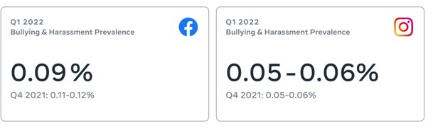事前検知技術の向上と拡充により、いじめと嫌がらせに関するコンテンツの事前検知率は第4四半期の58.8%から67%に上昇しました。また、Facebook上のいじめと嫌がらせに関するコンテンツの表示頻度は0.09%と、第4四半期の0.11~0.12%からわずかに減少しました。