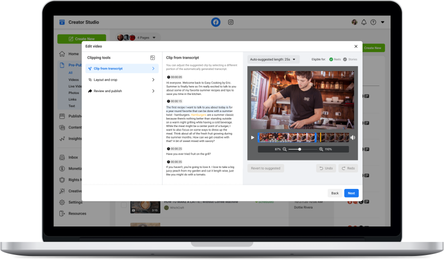 事前に録画した動画やライブ配信のアーカイブなど長尺の動画を投稿するクリエイターが、他のフォーマットを試しやすいよう、デスクトップ上でそれらの動画を簡単に編集し、リールとして投稿できる動画クリップ機能を導入します。このツールを使うと、クリエイタースタジオを通じて、公開済みの長尺動画をシームレスにFacebookリールに編集することが可能です。