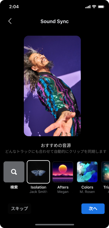 お気に入りのクリエイターなど、他の利用者が投稿した既存のリール動画をテンプレートとして使い、簡単に動画を作成することができます。真似してみたい動画を見つけて「テンプレートを使う」をタップすると、音源とクリップのフォーマット(個々のクリップの尺の長さや構成など)が読み込まれ、自分が撮影した動画や写真でカスタマイズできます。