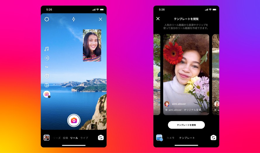 また、今年6月に導入したテンプレートもより使いやすくなります。テンプレートは、真似してみたい動画を見つけて「テンプレートを使用」をタップすると、音源とクリップのフォーマット(個々のクリップの尺の長さや構成など)が読み込まれ、自分が撮影した動画や写真でカスタマイズできる機能です。今後は個々の動画から読み込むだけでなく、リール専用カメラ*²で「テンプレート」を選ぶと、おすすめのテンプレートが表示されるようになります。(*²専用カメラを開くには、リール専用タブをタップし、右上にあるカメラアイコンを選びます)