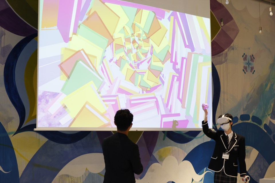 作品発表会では「メタバースの学校」をコンセプトに生徒各々が考えた作品を発表、ワークショップを通して制作したVR空間をプロジェクターに投影しながら紹介しました。