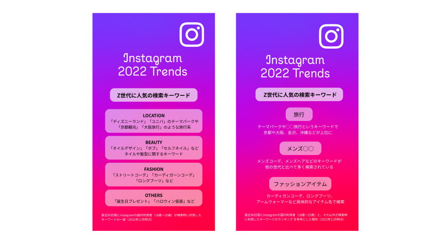 - Z世代に人気の検索キーワード:直近90日間にInstagramの国内利用者(18歳〜25歳)が検索時に利用したキーワードの一部と、それ以外の世代が使ったキーワードを参考にした傾向 (2022年11月時点)