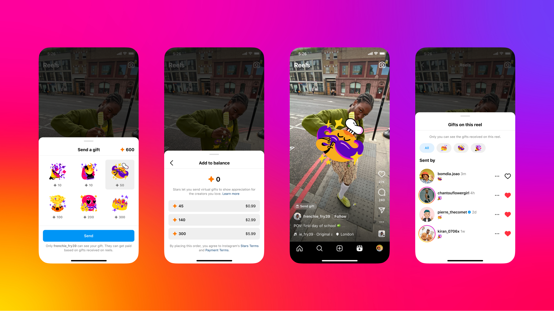 ファンがギフトを贈るには、サポートしたいクリエイターが投稿したリール動画を表示し、画面に表示される「ギフトを贈る」をタップします(注:本機能を設定でOFFにしているクリエイターの動画には表示されません)。スターの数に応じて6種類のギフトが表示されるので(1、5、10、15、20、300スター)、贈りたいオプションを選択します。