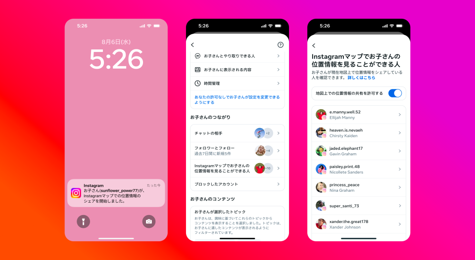 - ペアレンタルコントロール機能を利用している保護者は、Instagramマップについても子どもの体験を管理することができます。子どもが位置情報のシェアをオンにすると保護者に通知が送られ、安全に友達とシェアする方法について話し合いを持つ機会を提供します。地図上で位置情報のシェアを許可するかどうかを決めたり、子どもの位置情報を見ることができるアカウントを確認することも可能です。