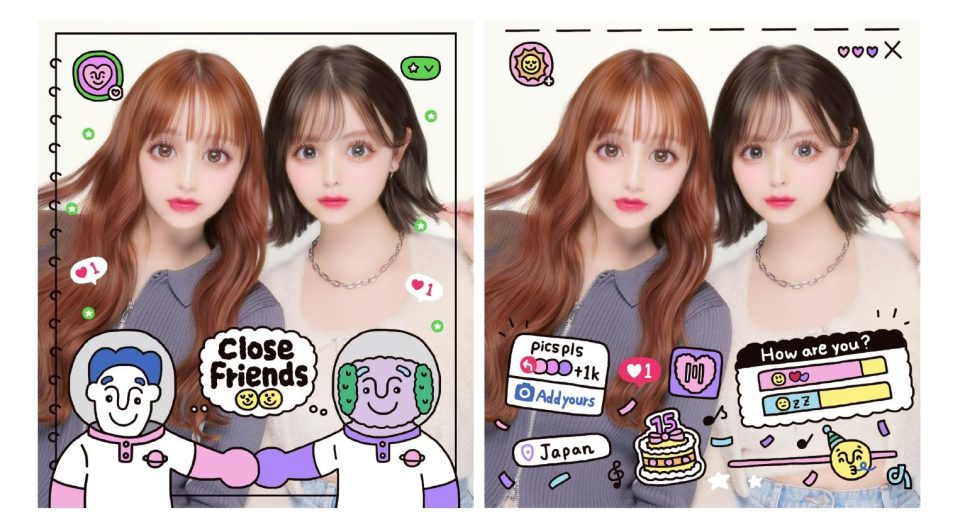 撮影したプリにワンタッチで落書きを追加できる機能に、Instagramで人気の機能・親しい友達をテーマにしたデザインと、ストーリーズなどで使われるスタンプをモチーフにしたデザインが登場します。