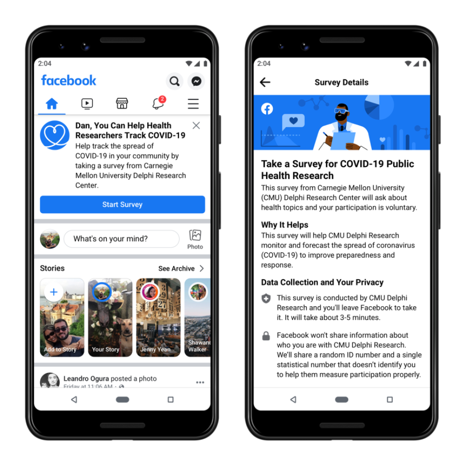4월 20일, 카네기 멜론 대학의 델파이 연구센터(Carnegie Mellon University Delphi Research Center) 팀은 Facebook이 홍보한 미국 내 증상 설문조사의 1차 연구 결과를 발표했습니다. Facebook은 카네기 멜론 대학의 조사 결과의 집계 데이터를 활용하여 첫 번째 보고서와 새로운 인터랙티브 지도를 제작했으며, 코로나19가 계속되는 동안 매일 업데이트를 진행할 계획입니다. Facebook CEO 마크 저커버그는 워싱턴 포스트를 통해 이러한 설문조사가 코로나19 대응에 있어 어떻게 중요한 도구로 활약할 수 있는지 설명하고, 해당 프로그램을 전 세계적으로 확장하기 위해 메릴랜드 대학(University of Maryland) 교수진과 협력하고 있다고 밝혔습니다.