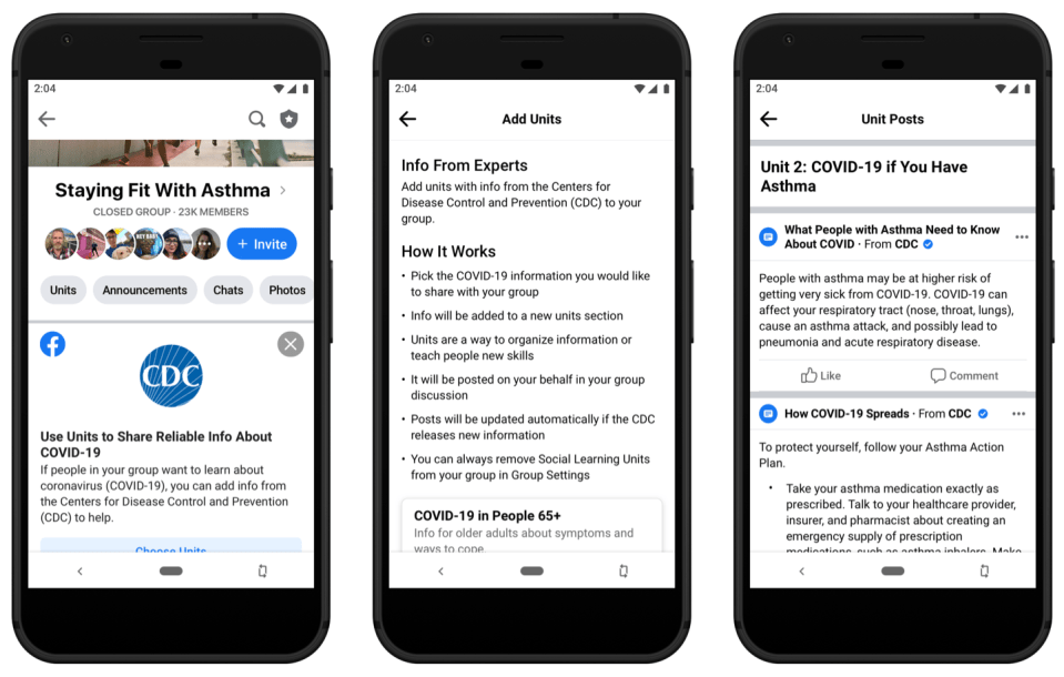 3월 18일, Facebook은 최신 뉴스와 정보뿐만 아니라 개인 건강을 유지하고 가족과 지역사회를 지원할 수 있는 리소스와 팁을 얻을 수 있는 정보의 중심지, 코로나19 정보 센터를 뉴스 피드 상단에 게시합니다.