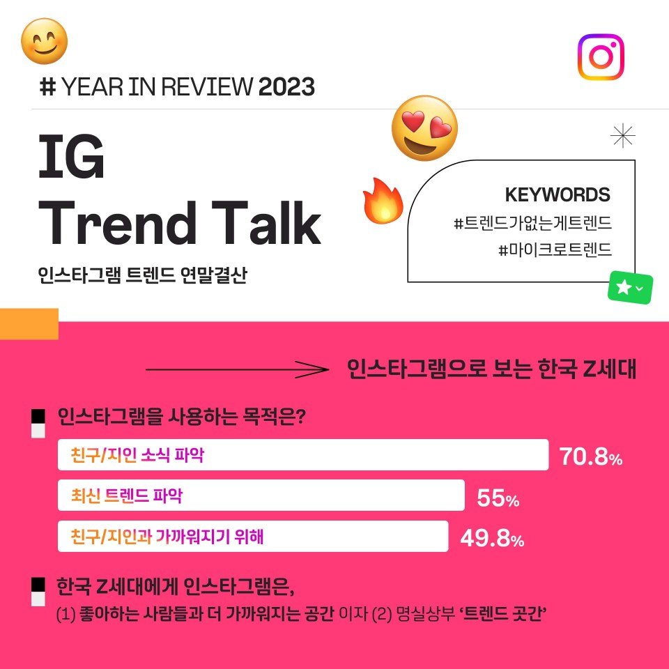 Instagram이 2023년 한 해를 돌아보는 연말결산 기자간담회를 개최하고 ‘올해의 Z세대, 크리에이터, 비즈니스 트렌드’를 발표했습니다.