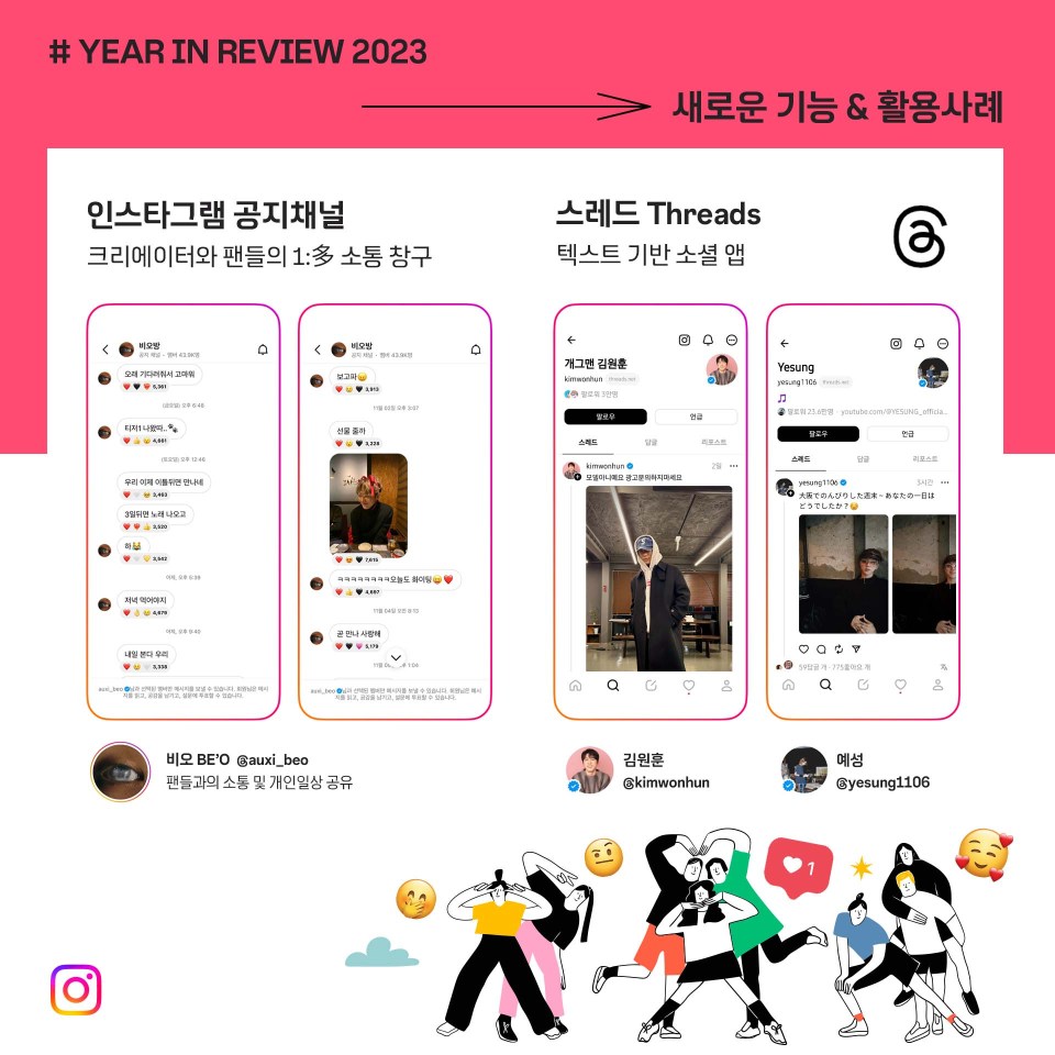 또, Instagram에서 주목하는 올해의 유망 크리에이터들도 소개됐습니다. ▲식지 않는 댄스 열풍에 힘입어 큰 사랑을 받고 있는 댄서 바다(@badalee__) ▲할아버지 모습과 반전되는 춤 실력을 선보이는 마임 크리에이터 벽돌할아버지(@brick_grandpa) ▲개성이 담긴 스토리를 제작하는 스토리 전문 크리에이터 공률(@ryul.x.____) 등 다양한 크리에이터와 함께, 김 총괄은 ▲일상을 유쾌하게 풀어내는 개그맨 김원훈(@kimwonhun) ▲팬들과 깊게 교류하는 걸그룹 에스파(@aespa_official) 등 크리에이터 및 셀럽들의 Threads 활용 사례도 조명하며 내년에도 다채로운 콘텐츠로 왕성한 활동을 이어나갈 모든 크리에이터의 행보를 격려했습니다.
