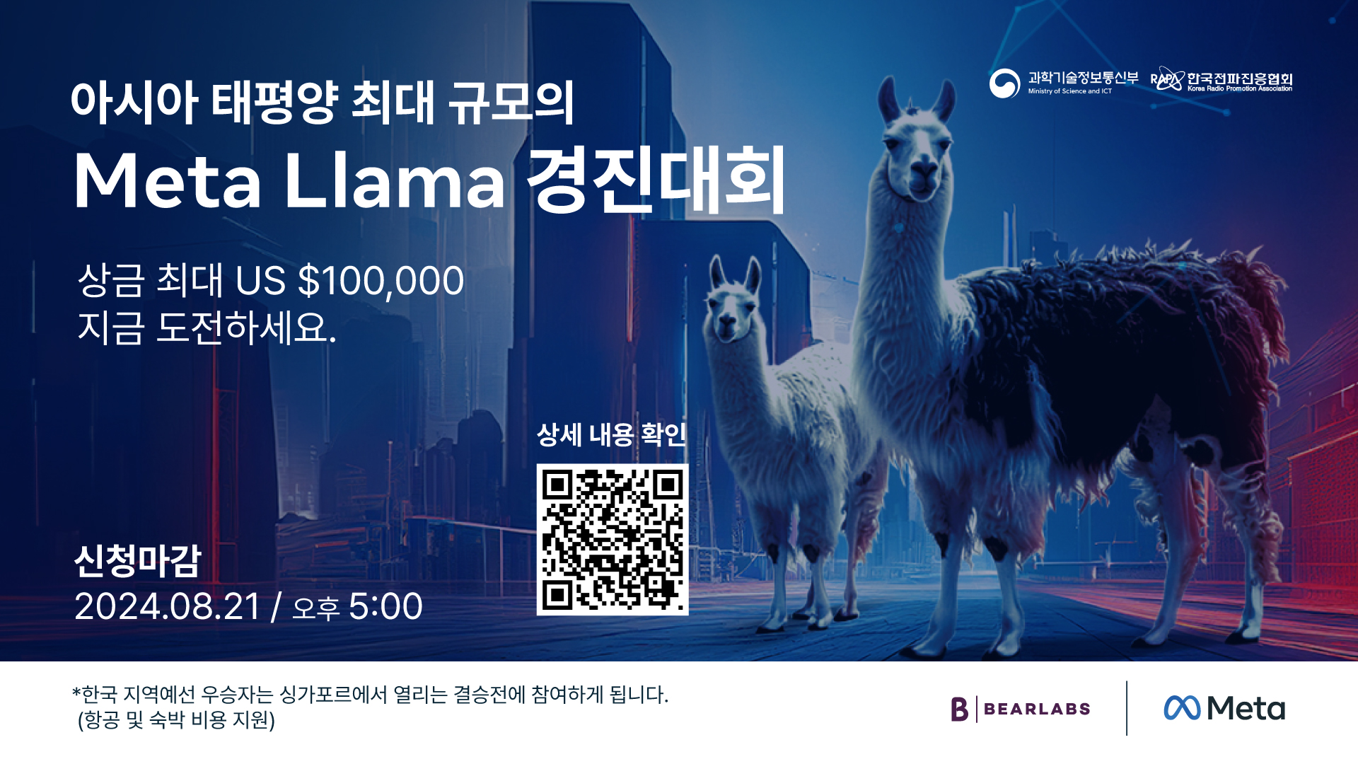 한편, 이번 경진대회와는 별도로 Meta는 한국 포함 전 세계 Llama 사용자를 대상으로 Llama 3.1 임팩트 지원금(Llama 3.1 Impact Grants) 신청 공개모집을 시작했습니다. 오는 11월 22일까지 신청 가능하며, 구체적인 내용은 여기에서 확인할 수 있습니다.