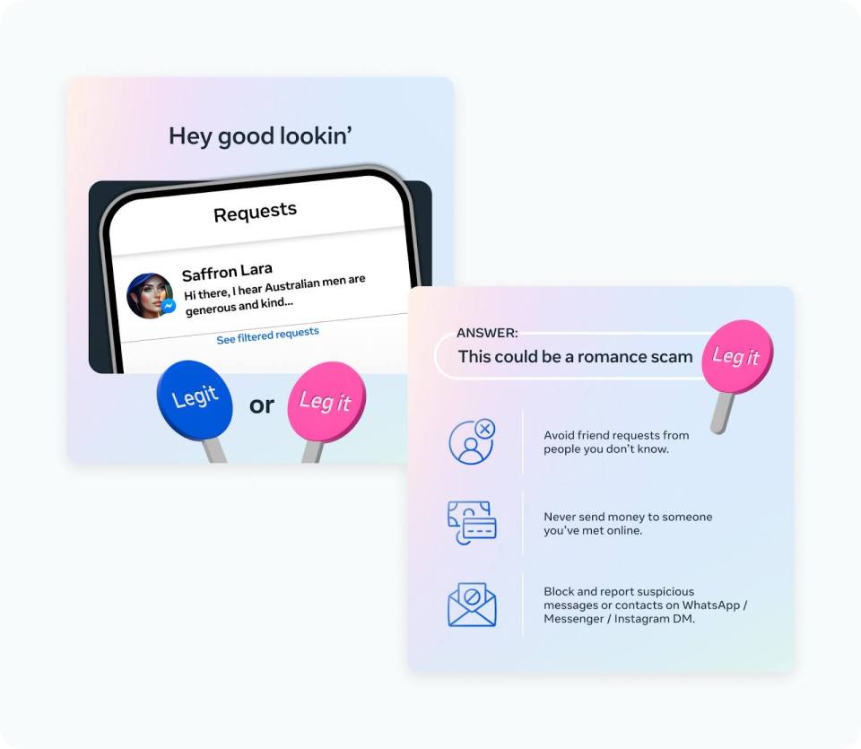 사기범들은 끈질기며 사람들을 속이기 위해 휴일이나 각종 기념일을 이용합니다. 발렌타인데이를 맞아, Meta는 글로벌 사기 예방 캠페인의 일환으로 Facebook Messenger, WhatsApp 및 Instagram에서 사용 가능한 안전 도구들을 소개하고자 합니다. 또한 이용자들을 보호하기 위해 온라인 로맨스 스캠에 대한 새로운 연구 결과와 군인 등을 사칭한 사기 행위에 대한 단속 노력을 공유하고자 합니다.