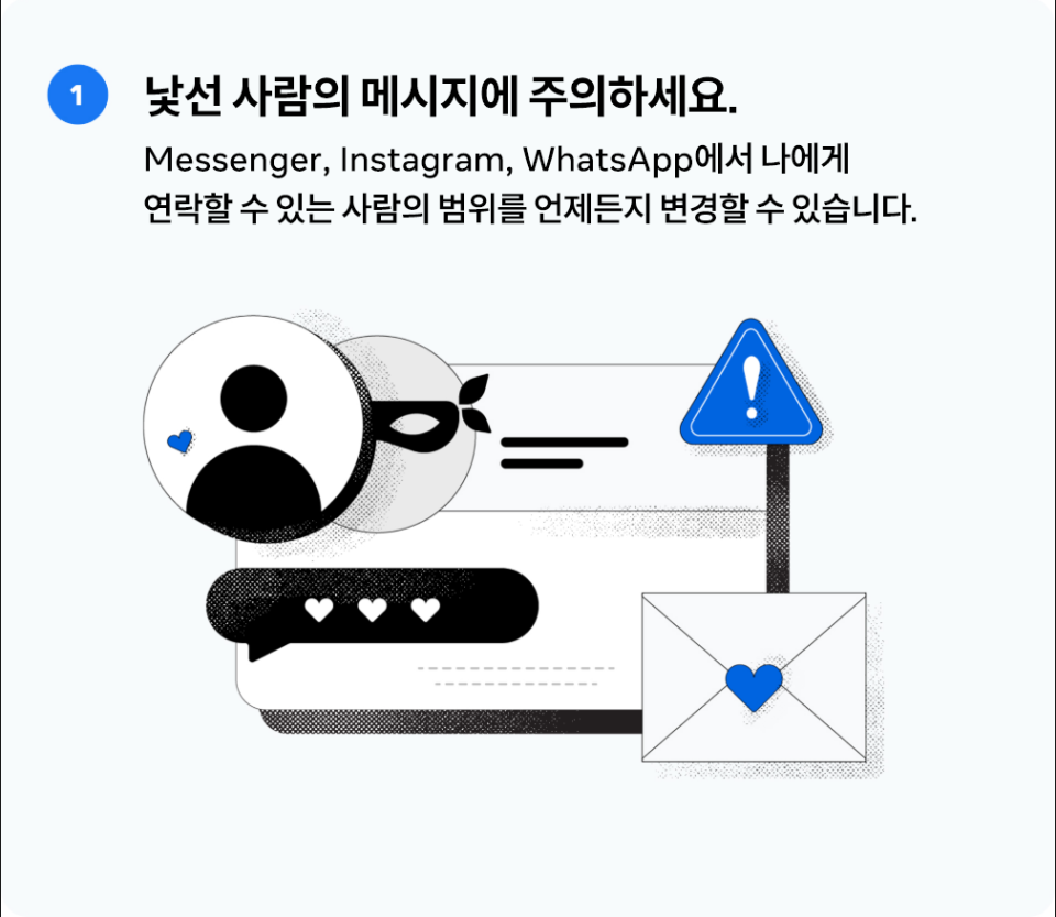 - Facebook Messenger, WhatsApp, Instagram에서 사용 가능한 다양한 안전 도구들을 소개해, 이번 발렌타인데이에 사람들이 Meta의 앱을 안전하게 이용하고 로맨스 스캠 피해로부터 이용자를 보호하고자 합니다.
