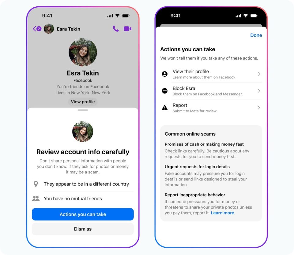 Facebook Messenger는 어떤 이용자가 의심스러운 활동을 보인 계정이나 다른 국가에 거주하는 걸로 보이는 사람과 대화를 나눌 때 주의하라고 안내하는 안전 알림(Safety Notices) 기능을 도입했습니다. Instagram에서도 청소년 이용자에게 비슷한 알림 기능을 테스트하고 있으며, 앞으로 더 많은 사용자에게 확장 도입할 계획입니다.