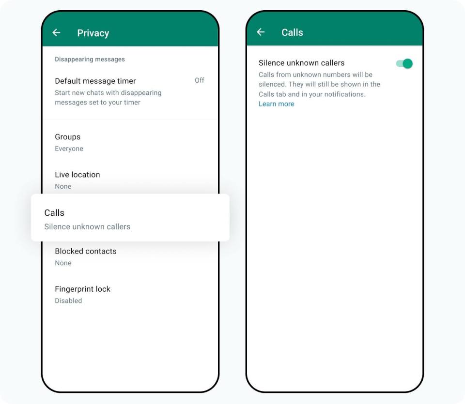 WhatsApp에서는 모르는 발신자의 전화를 무음 처리해 잠재적인 사기범을 비롯한 원치 않는 사람들의 연락을 피할 수 있습니다.