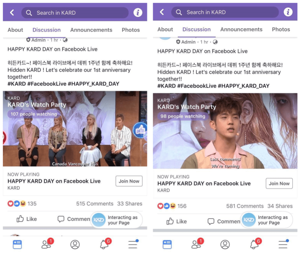 - 한국의 인기 K-Pop그룹인 KARD는 전 세계 팬들과 함께 Watch Party를 열고, 데뷔 1 주년을 기념했습니다. 새로운 앨범과 뮤직 비디오를 위한 예고 영상을 선보였으며 그룹 멤버들과 Facebook Live 방송도 함께 진행했습니다.