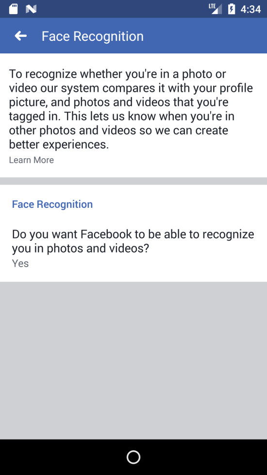 Usted <controla> si Facebook puede reconocerlo en fotos y videos. En los próximos días, comenzará a ver un simple botón de On / Off en lugar de configuraciones individuales para las funciones que usan tecnología de reconocimiento facial. Diseñamos esto como un interruptor de encendido / apagado porque las personas nos informaron que prefieren un control más simple y sencillo en lugar de tener que decidir en cada oportunidad de manera separada. Para obtener más información sobre estas y otras funciones con tecnología de reconocimiento facial, visite el <Centro de ayuda> o su <configuración de cuenta>.