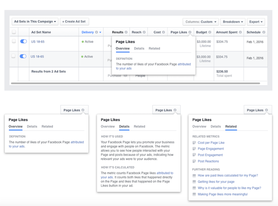 - Definiciones más consistentes: También actualizaremos nuestra sección de consejos y los glosarios en todas nuestras herramientas para asegurar que estamos explicando nuestras métricas de manera consistentes (incluyendo en detalle los insights que son aproximaciones). Por ejemplo, a medida que hemos creamos nuevas experiencias como Canvas y lead forms, la métrica de clicks a los enlaces ha evolucionado para incluir clicks a destinos tanto dentro como fuera de Facebook. Habíamos actualizado la definición de clicks a enlaces en nuestra herramienta de creación de anuncios y ahora estamos actualizándolas en todas nuestras herramientas. También estamos aclarando la descripción de las métricas de vistas de video (3, 10 y 30 segundos) para incluir la palabra “agregada” y explicar con mayor claridad que incluye el tiempo sumado de visualización de al menos ese número de segundos.