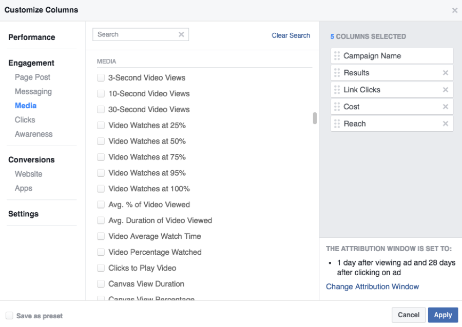 - Nombres más descriptivos: Actualizaremos los nombres de las métricas para asegurar que sean claras (i.e. “view content” → “website view of content,” y “video views” → “3-second video views”).