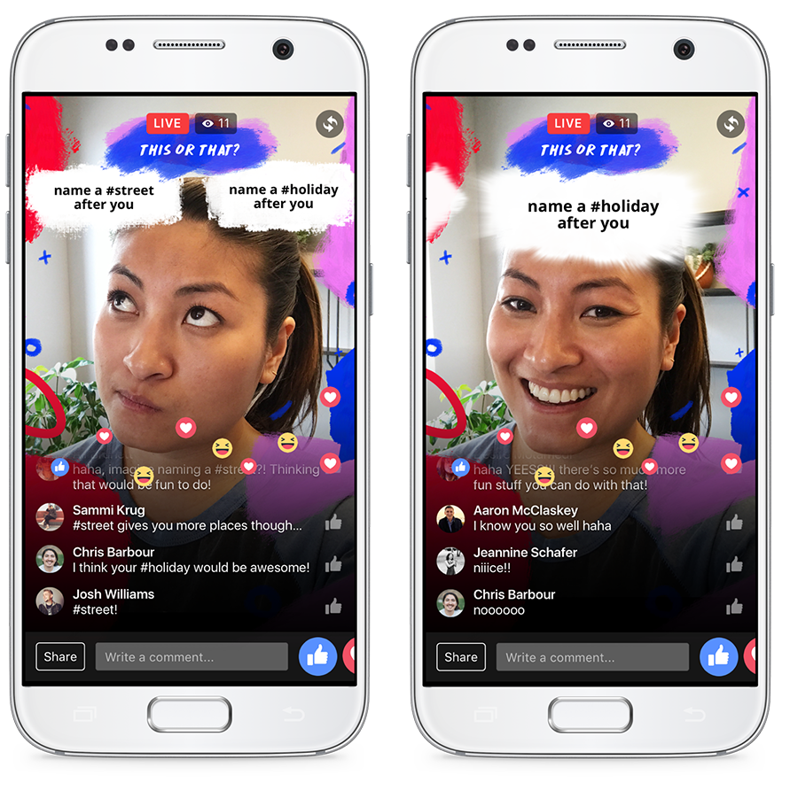 - This or That es un efecto creado por Facebook para mostrar cómo los generadores de contenido y los espectadores pueden interactuar en vivo de nuevas formas. Es posible elegir dos opciones de Live y los espectadores pueden comentar usando un hashtag para elegir la opción que piensan que el transmisor escogerá. El hashtag con más votos ganará.