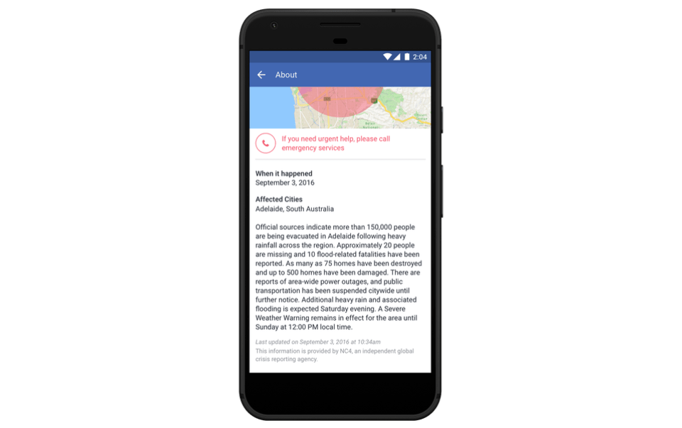 Después de ponerse a salvo, las personas comparten información adicional para llevar tranquilidad a sus amigos, informar de su bienestar y dar más contexto sobre la crisis. Para facilitar este proceso, las personas ahora pueden agregar un comentario personalizado en la herramienta Safety Check y dar más información a sus amigos sobre lo que está sucediendo. Esta nota personalizada aparecerá en la publicación de la Sección de Noticias que se genera automáticamente al activar la función Safety Check.