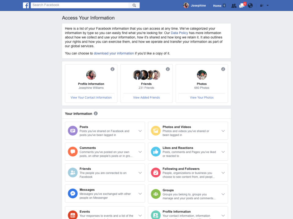 También estamos facilitando que las personas puedan descargar sus datos compartidos con Facebook – son sus datos, después de todo. Puedes descargarlos en una copia segura e incluso migrarlos a otro servicio. Esto incluye fotos que has subido, contactos que has añadido a tu cuenta, publicaciones en tu línea de tiempo y más.