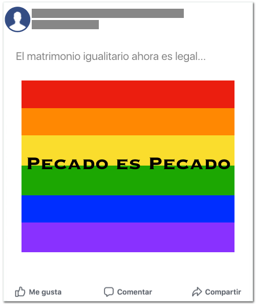 En este ejemplo, la imagen y el comentario sugieren que el matrimonio entre personas del mismo sexo es un pecado. Debido a que el mensaje se dirige a la institución del matrimonio igualitario, no a una persona o grupo de personas específico, lo permitimos. Si el mismo texto «pecado es pecado» se combinara con la foto de una pareja del mismo sexo, se eliminará.