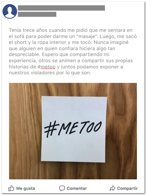 El movimiento #MeToo, y las desgarradoras historias de acoso que fueron valientemente compartidas por personas de todo el mundo, nos llevaron a evaluar la necesidad de algunas excepciones. Este ejemplo se basa en una publicación real en la que una víctima relató haber sido abusado sexualmente siendo menor de edad. Su historia fue ampliamente compartida. Dado el contexto, y la intención de crear conciencia y dar a conocer un tema importante, decidimos hacer una excepción y permitir que esta publicación sea un contenido de interés periodístico. También permitimos que otros compartan la publicación si es para apoyar a la víctima o para condenar a su abusador. Si la publicación se compartió sin contexto o con un título neutro, lo quitamos. De más está decir que, si la misma historia fuese contada por el abusador, sería eliminada.