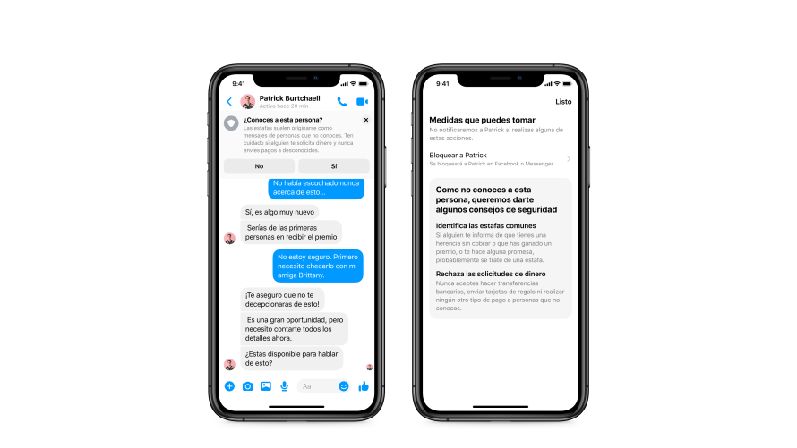 Con mucha frecuencia, las personas interactúan con alguien en línea que creen conocer o en quien confían, cuando en realidad es un estafador o impostor. Estas cuentas pueden ser difíciles de identificar al principio y las consecuencias pueden ser significativas. Messenger ya filtra mensajes no deseados o software malicioso y ofrece consejos para evitar estafas comunes. Nuestros nuevos avisos de seguridad también ayudan a orientar a las personas sobre cómo detectar estafas o impostores, y les ayudan a tomar medidas para evitar una interacción desafortunada.