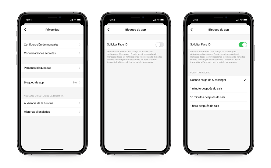 Bloqueo de App utiliza la configuración de privacidad de tu dispositivo, como la autenticación facial o de huellas dactilares, para desbloquear la aplicación de Messenger, y tu identificación táctil o facial no se transmite a Facebook ni se almacena. La función está disponible hoy en iPhone y iPad y llegará a Android en los próximos meses.
