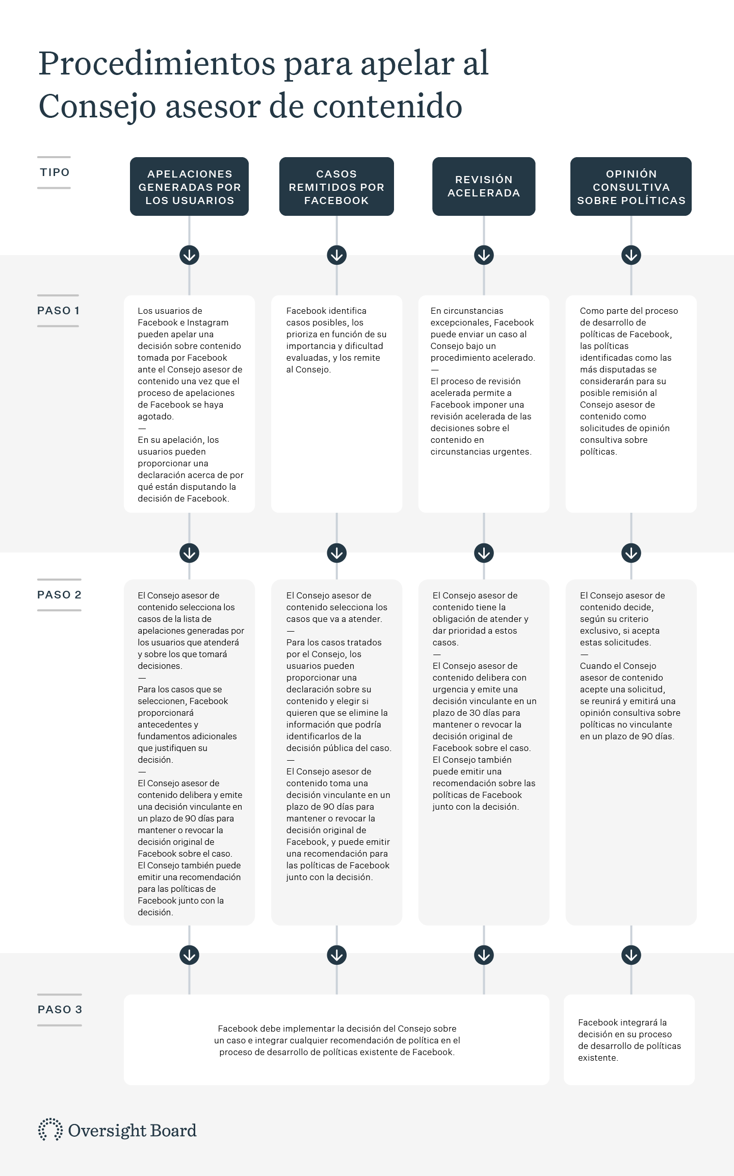 Al momento del lanzamiento, debido al modo en el que funcionan los sistemas de moderación actuales de Facebook, los usuarios solo podrán solicitar una apelación al Consejo en aquellas situaciones en que Facebook haya eliminado el contenido. Sin embargo, nuestro objetivo es incorporar lo antes posible todos los tipos de contenido contemplados en los estatutos, y estamos desarrollando las herramientas y los sistemas necesarios para lograrlo. Esto hace referencia, por ejemplo, a los casos en que una persona cree que el contenido de otra debería eliminarse o que un Grupo infringe nuestras Normas Comunitarias y debería eliminarse. De todas maneras, las decisiones sobre el contenido que Facebook no eliminó se contemplarán desde el primer día, ya que Facebook puede remitir dicho contenido directamente al Consejo.