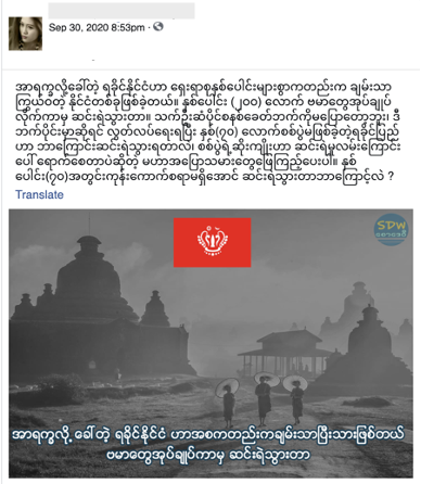 Traducción: La nación Rakáin llamada Arakan fue una vez un país muy rico hace muchos años. Se convirtió en una región pobre después de que Myanmar gobernó la región durante unos doscientos años. Sin mencionar el sistema de monarquía hereditaria. No hubo guerra en Rakáin 70 años después de obtener la independencia. ¿Por qué Rakáin se convirtió en una región pobre? Aquellos que afirman que la guerra podría traer pobreza deberían responder a la pregunta: ¿Por qué Rakáin se volvió extremadamente pobre en estos 70 años?