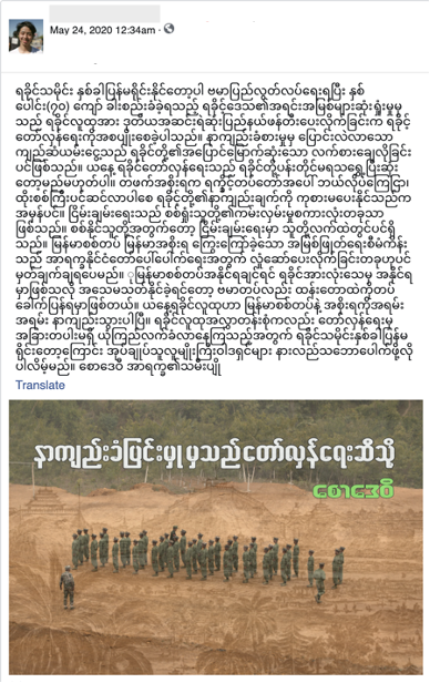 Traducción: La historia de Rakáin no se repetirá dos veces. La revolución de Rakáin comenzó porque 70 años después de la independencia de Myanmar, Rakáin sufrió una pérdida de recursos, lo que provocó que la gente de Rakáin viviera en la segunda región más pobre. Este sufrimiento se ha convertido en humo que es una severa venganza. La revolución de Rakáin de hoy nunca va a terminar. No importa cómo el gobierno de Myanmar describa a Rakáin y cómo atacarán a Rakáin, el sufrimiento de la gente de Rakáin nunca se curará. La paz es solo una palabra que pueden ofrecer los derrotados. Para aquellos con la victoria, la paz siempre está en sus manos. Cabe señalar que el ejército de Myanmar y el gobierno de Myanmar se han sentido muy orgullosos de su proyecto para eliminar todos los recursos de Rakáin y esto estimula a Arakan a atacar. El ejército de Myanmar solo ganará cuando mueran todos los habitantes de Rakáin y, además, si no se puede eliminar a todos los habitantes de Rakáin, los militares de Myanmar tendrán que volver a su ruta original. Hoy en día, la gente de Rakáin odia al ejército y al gobierno de Myanmar. Dado que Rakáin de todos los ámbitos de la vida acepta que no hay nada mejor que la revolución, la historia de Rakáin no se repetirá dos veces. Todos los gobernadores y nacionalistas deben comprenderlos. Hija de Saw Devi Ar Rakha