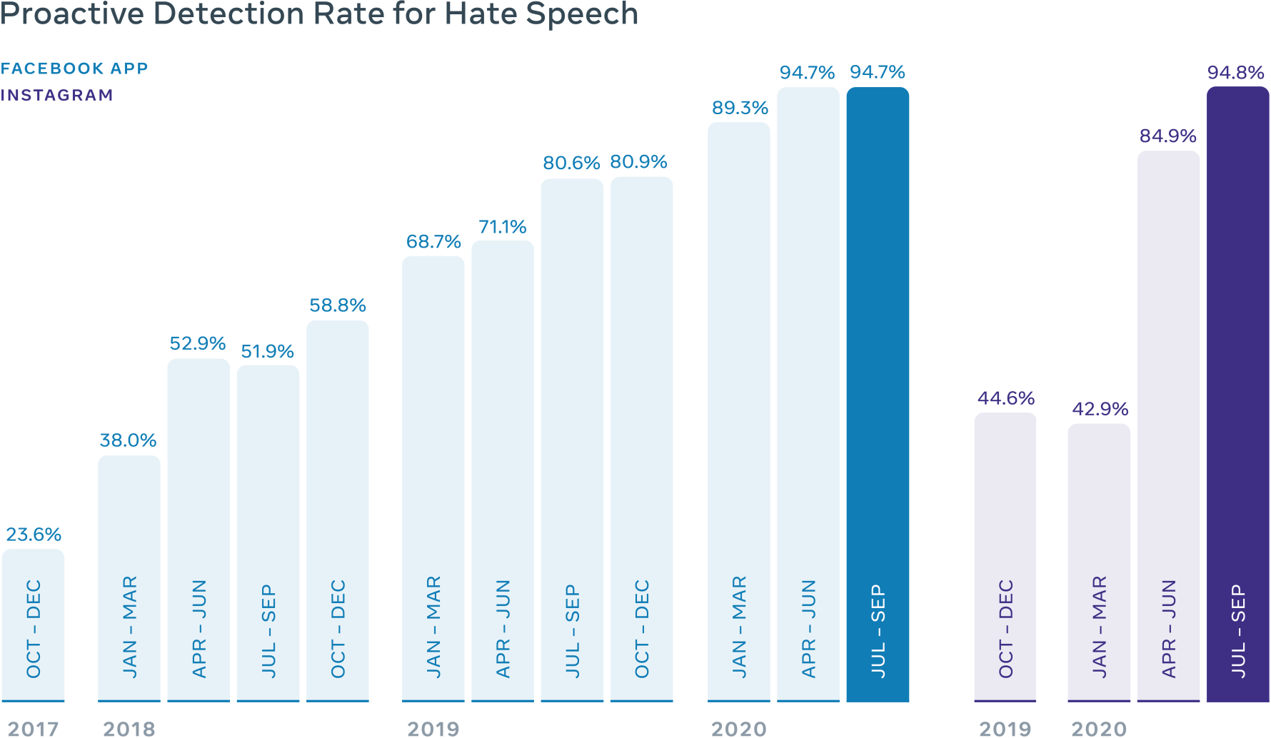 Con el tiempo, los avances en las tecnologías de inteligencia artificial nos han permitido eliminar una mayor cantidad de contenido de discurso de odio de Facebook y encontrarlo más del mismo antes de que los usuarios lo denuncien. Cuando comenzamos a informar nuestras métricas de incitación al odio, en el cuarto trimestre de 2017, nuestra tasa de detección proactiva fue de 23,6%. Esto significa que del discurso de odio que eliminamos, 23,6% se encontró antes de que un usuario nos lo denunciara. La mayoría restante fue eliminada después de que los usuarios lo reportaran. Hoy, detectamos proactivamente cerca de 95% de discurso de odio que removemos. Ya sea que lo detectemos proactivamente o sea reportado por los usuarios, a menudo usamos IA para actuar en casos sencillos y priorizar los más difíciles para nuestros revisores, en donde se debe de considerar el contexto y los matices.