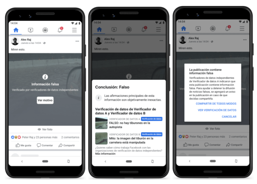 Por su lado, Facebook, como lo contempla su programa de verificación de información desde 2016, se encarga de reducir el alcance de las noticias que hayan sido marcadas como falsas, y envía una notificación a los usuarios en caso de que vayan a compartirlas.