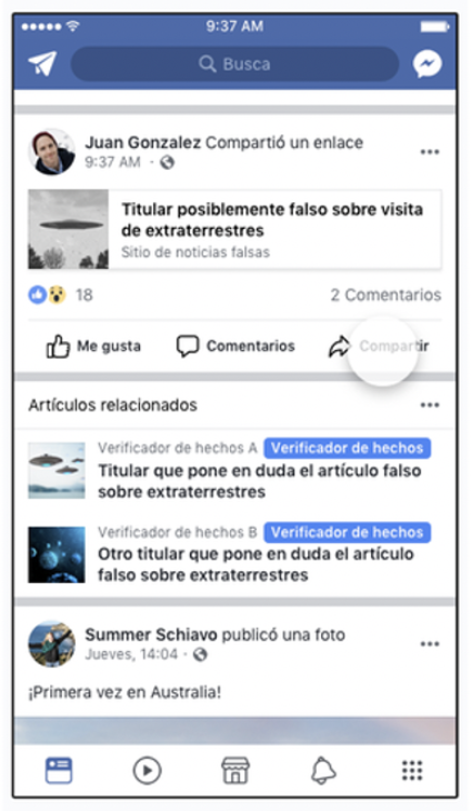 De igual forma, para que las personas decidan en qué fuentes confiar, qué leer y qué información compartir, Facebook les muestra artículos redactados por los verificadores independientes que explican por qué el contenido es falso. Este será visible debajo de la noticia que ha sido calificada, en Artículos Relacionados.