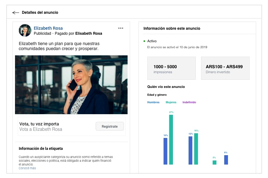 Todos los anuncios políticos y electorales se almacenarán en una Biblioteca pública de anuncios durante siete años. Con esa información, producimos el Reporte de Transparencia, que muestra el número total de anuncios y gastos publicitarios en política y elecciones en Facebook e Instagram, así como también información detallada sobre quién pagó, cuál fue la inversión aproximada y la audiencia alcanzada.