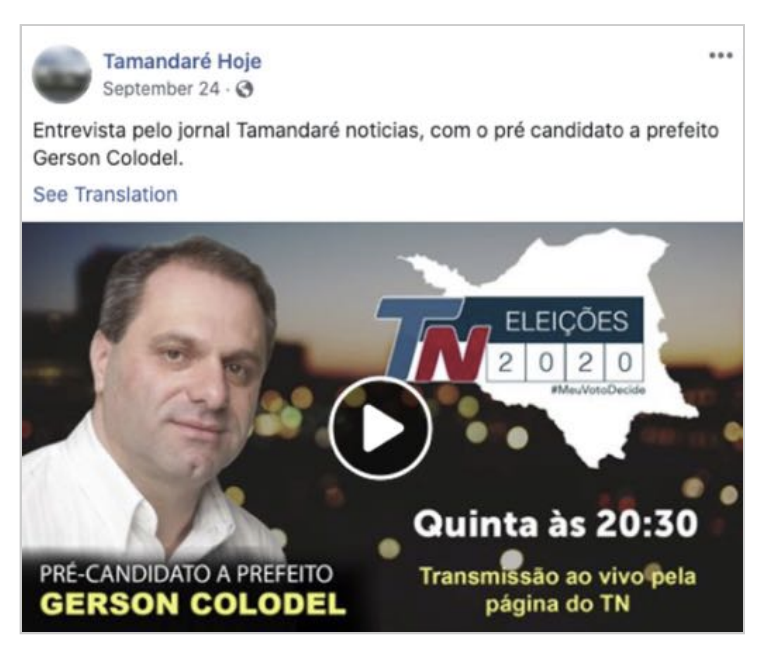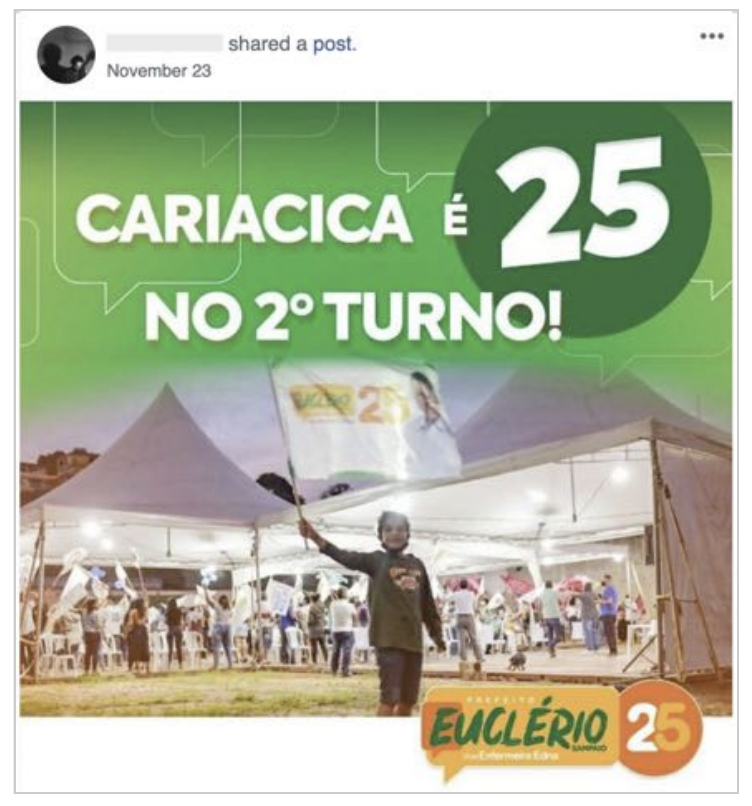 Esta actividad se enfocaba en tres municipios del estado de Espírito Santo, Serra, Vitória y Cariacica, y amplificaba las Páginas y publicaciones relacionados con el candidato municipal de cada ciudad. En particular, las personas detrás de esta campaña compartían y comentaban en portugués las publicaciones sobre un candidato del Partido Democrático Laborista en Serra, un candidato del partido Cidadania en Vitória, y otro candidato del partido DEM en Cariacica.