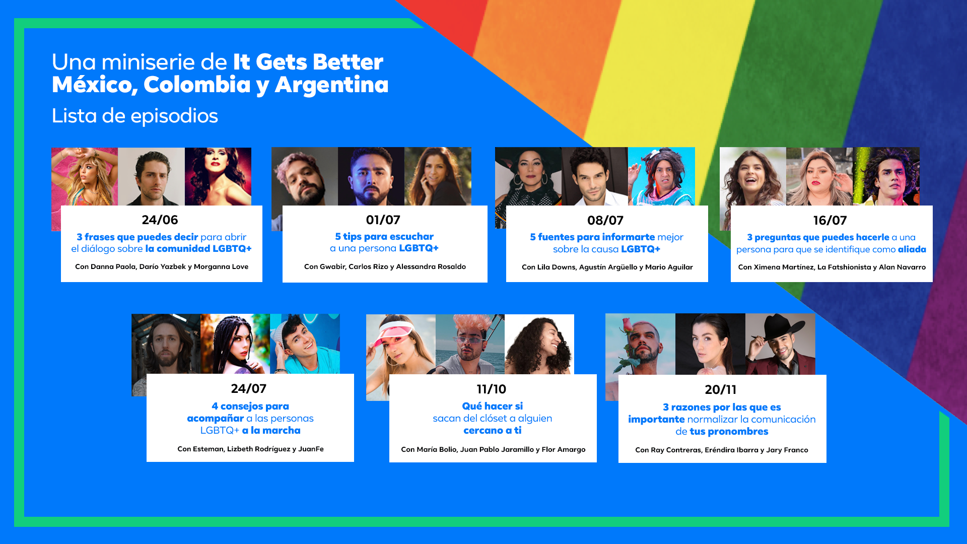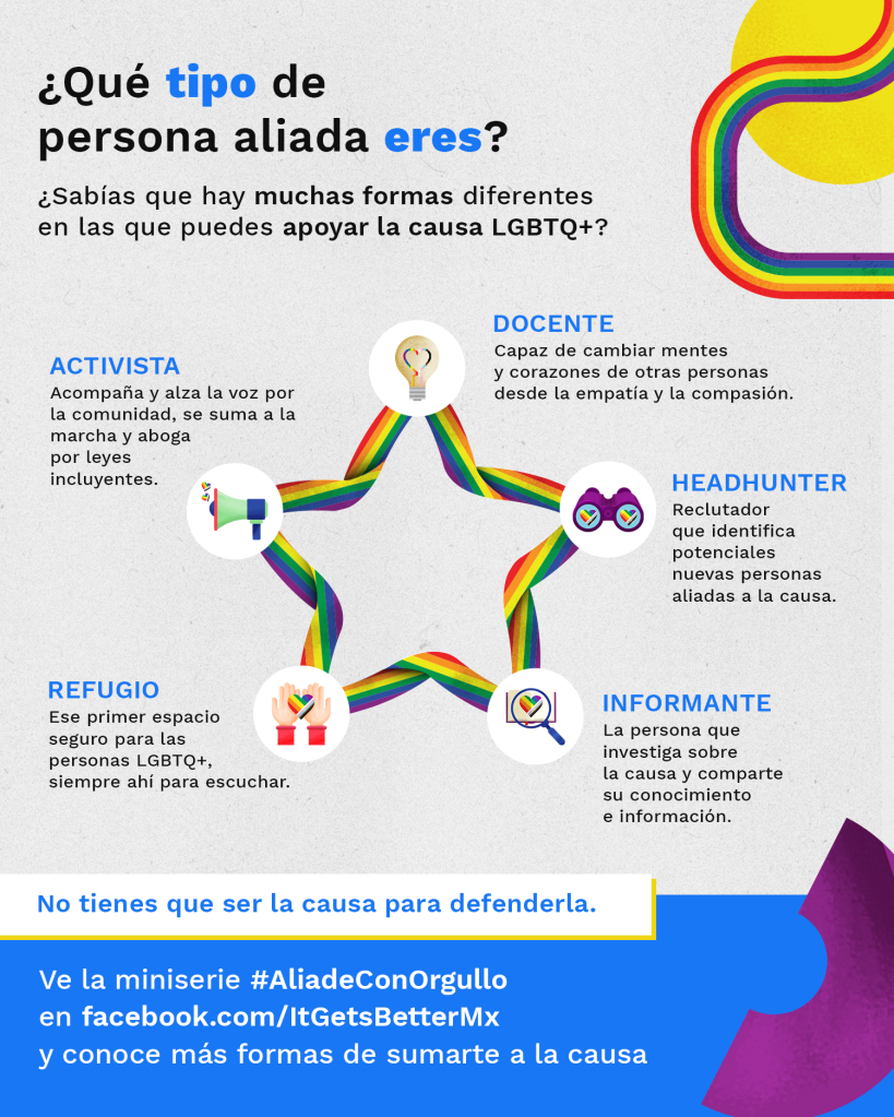 A partir del 24 de junio, se transmitirá la miniserie #AliadeConOrgullo a través de Facebook Watch en las Página de It Gets Better en México, Colombia y Argentina –ve el episodio 1 aquí. Con un total de 7 episodios, cada uno incluye consejos para ser una persona aliada de la comunidad LGBTQ+ e incluye la participación de celebridades como Alessandra Rosaldo, Danna Paola, Darío Yazbek, Eréndira Ibarra y los creadores de contenido Mario Aguilar y Priscila Arias ‘La Fatshionista’.
