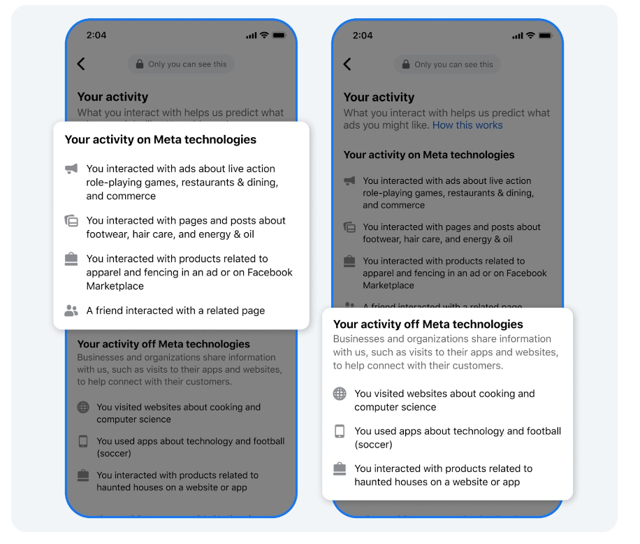 - Estamos actualizando nuestra herramienta «¿Por qué veo este anuncio?», con el fin de brindar más transparencia sobre la actividad que se realiza dentro y fuera de nuestras plataformas, lo que permitirá informar los modelos de aprendizaje automático que utilizamos para seleccionar y entregar los anuncios que se ven.