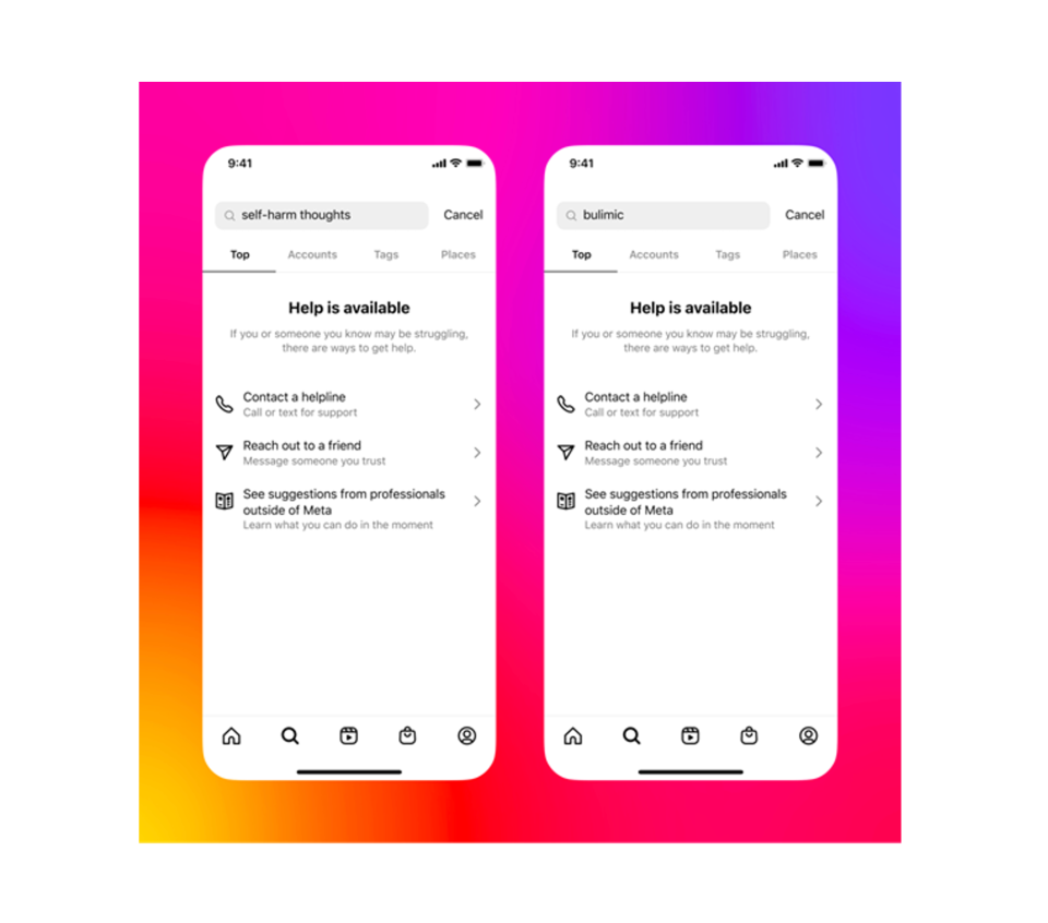Queremos que las personas encuentren apoyo si lo necesitan, así que seguiremos compartiendo recursos de organizaciones expertas, como la National Alliance on Mental Illness, cuando alguien publique contenido relacionado con su lucha contra las autolesiones o los trastornos alimentarios. Estamos empezando a aplicar estos cambios a los adolescentes menores de 18 años y en los próximos meses estarán plenamente implantados en Instagram y Facebook.