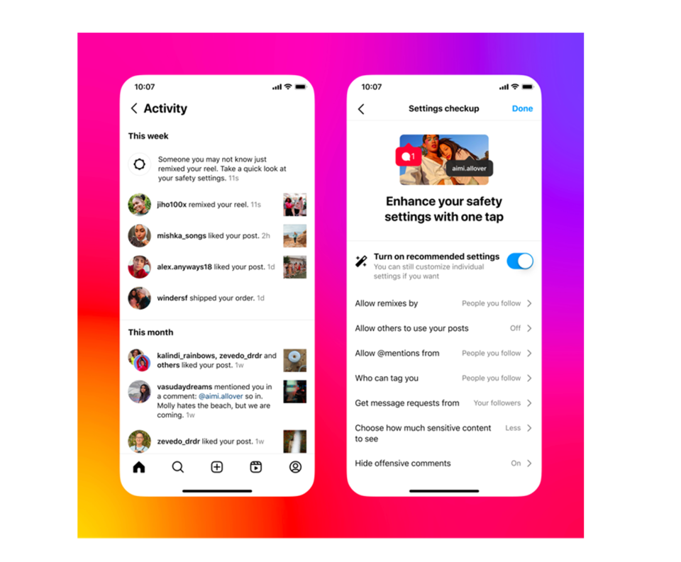 Para asegurarnos de que los adolescentes comprueban regularmente su configuración de seguridad y privacidad en Instagram y que conocen las herramientas de privacidad más recientes, les enviamos nuevas notificaciones invitándoles a actualizar su configuración para tener una experiencia más privada. Si los adolescentes eligen «Activar configuración recomendada», cambiaremos automáticamente su configuración para restringir quién puede volver a publicar su contenido, etiquetarlos o mencionarlos, o incluir su contenido en Reels Remixes. También nos aseguraremos de que solo sus seguidores puedan enviarles mensajes y ayudaremos a ocultar los comentarios ofensivos.