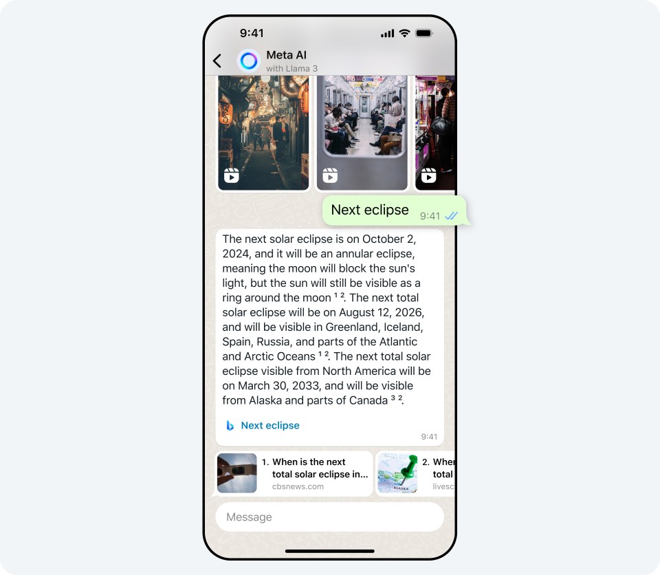 Meta AI también estará disponible en la búsqueda a través de Facebook, Instagram, WhatsApp y Messenger. Puedes acceder a información en tiempo real de toda la web sin tener que rebotar entre aplicaciones. Digamos que estás planeando un viaje de esquí en tu chat de grupo de Messenger. Usando la búsqueda en Messenger puedes pedirle a Meta AI que encuentre vuelos a Colorado desde Nueva York y que averigüe cuáles son los fines de semana menos concurridos para ir, todo sin salir de la aplicación Messenger.