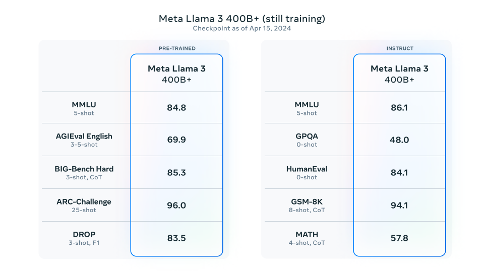 Nuestros modelos más grandes superan los parámetros de 400B y, aunque todavía están en fase de formación, nuestro equipo está entusiasmado con su evolución. En los próximos meses, publicaremos varios modelos con nuevas funciones, como la multimodalidad, la capacidad de conversar en varios idiomas, una ventana de contexto mucho más larga y funciones generales más potentes. También publicaremos un artículo de investigación detallado una vez hayamos terminado de entrenar a Llama 3.